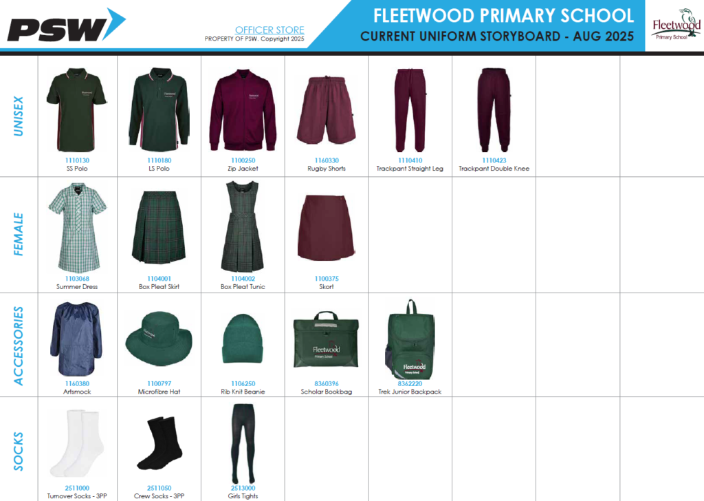 Uniform at Fleetwood Primary School is compulsory. We believe that a compulsory school uniform fosters equality, assists in student welfare and promotes a positive school identity and image in a variety of community and public settings. Please ensure that the child’s name is clearly marked on all items of clothing – this allows lost items to be returned. If an item of clothing is lost, please contact the school office as it may be in lost property.