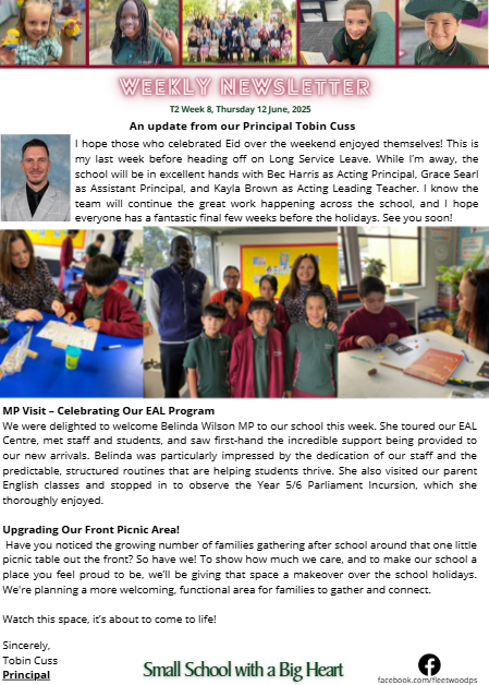 Parents are encouraged to follow the Fleetwood Primary School Facebook page. This page, in addition to Compass, communicates important information to parents and posts photos of the everyday goings-on at school.